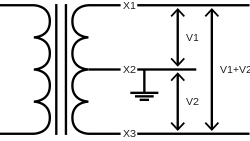 Um transformador que alimenta um sistema de fase dividida possui um enrolamento de entrada monofásico (primário). O enrolamento de saída (secundário) possui uma derivação (comumente chamado tape) central, esta conectada a um sistema de aterramento, conforme mostrado na Fig. 1, cada ponta (X) em relação ao centro tem metade da tensão de ponta a ponta.