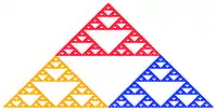 Ou seja, 3 cópias do conjunto inicial são feitas, na metade do tamanho, cada uma se posicionando em um dos extremos de um triângulo, deixando o centro do triângulo livre.