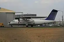 Uma aeronave de Havilland Dash 8 VH-LCL no Aeroporto de Essendon em 2007. Esse veículo é equipado com o sistema de sondas laser e é usado pelas forças militares australianas para pesquisas hidrográficas.