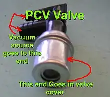 A válvula PCV é um elemento que regula o equilíbrio do sistema de respiração dos gases do cárter. Estes devem ser escoados ao mesmo tempo em que entram. Basicamente, a válvula é constituída por uma mola, um êmbolo e os orifícios através dos quais os gases são escoados[2]. A velocidade do motor determina o grau de abertura das válvulas. À velocidade de marcha lenta, o vácuo no colector de admissão contrai a mola, fazendo com que o êmbolo feche o orifício de saída dos gases - que são escassos nesse regime - a partir do cárter. No entanto, quando a velocidade do motor aumenta, o vácuo no colector é menor, a mola se estende e o êmbolo se move para trás, permitindo assim que os gases fluam livremente para o colector de admissão, onde são misturados com ar fresco.