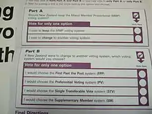 Cédula de votação no referendo sobre o sistema de votação na Nova Zelândia em 2011.