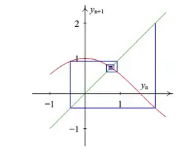 Outro tipo de diagrama que será muito útil para analisar os sistemas dinâmicos discretos em uma dimensão é o diagrama de degraus, que consiste em representar as funções e e uma série alternada de segmentos verticais e horizontais que unem os pontos etc.
