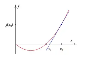 O método de Newton permite encontrar as raízes da equação. Começamos por admitir que existe uma raiz perto do valor e melhoramos a nossa aproximação inicial encontrando o ponto onde a tangente em corta o eixo dos (ver figura)