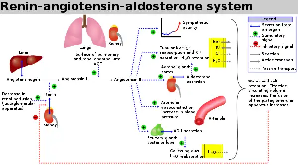 Estão identificados no corpo humano dois diferentes tipos de sistemas renina-angiotensina: o circulante, descrito há bastante tempo, e o local, descrito mais recentemente e que parece desempenhar papel importante na homeostase circulatórigênio é produzido pelo fígado, que requer glicocorticóides do córtex adrenal e estrógeno das gônadas; a renina é liberada pelos rins, enquanto que a enzima de conversão de angiotensina I em angiotensina II (ECA) é encontrada no endotélio vascular de vários órgãos. A aldosterona é liberada pelo córtex suprarrenal estimulado pela angiotensina II.