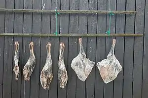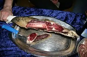 A secagem demora mais de um ano, sendo o produto final consumido cru[1], cortado em fatias finas. Pode ser consumido com pão rugbrød.