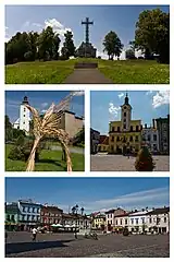 Colina Kaplicówka com a cruz papal, Pégaso com a igreja de São Pedro e São Paulo ao fundo, prefeitura de 1797, praça histórica | |||