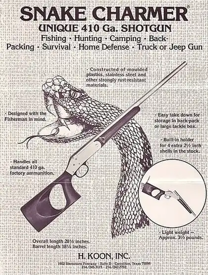 A Snake Charmer foi introduzida em 1978, pela H.Koon, Inc, de Dallas, Texas.[1][2] Originalmente vendida por $ 89,95[2] e foi comercializada como uma espingarda de utilidade geral perfeita para "Pesca - Caça - Camping - Trilha - Sobrevivência - Defesa residencial - Arma veicular".