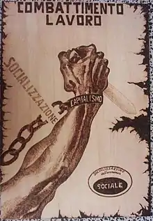Em 1933, Mussolini anunciou que "o modo de produção capitalista foi superado", e com ele o liberalismo econômico, proclamando a implementação definitiva do corporativismo como um modelo a seguir, acrescentando que seria implementado gradualmente.[15] No inverno de 1941, Mussolini falou de um programa de socialização onde os trabalhadores faziam parte do governo fascista que considerava realizá-lo depois de vencer a guerra.[16] Em maio de 1943, Mussolini se encontraria com Tullio Cianetti. Nesse encontro, Cianetti daria a conhecer a Mussolini suas preocupações com o corporativismo, visto que as "posições capitalistas" haviam se fortalecido e havia "uma tendência ao monopólio". Ambos discutiriam a implementação da socialização.[17]