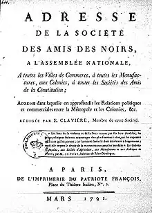 Em março de 1790, Mirabeau fez um discurso no Clube Jacobino, que por muito tempo permaneceu inédito, contra o tráfico de africanos escravizados. Em 1791, a Sociedade chegou a realizar parte de seu programa, ao aprovar, em 24 de março de 1792, a igualdade cívica dos homens de cor livres. Pouco depois, em 10 de abril, a associação tentou, sem sucesso, abolir o tráfico de africanos escravizados. Em 11 de agosto de 1792, com o apoio da Sociedade, um segundo decreto foi aprovado, revogando gratificações e honrarias oferecidas aos proprietários de navios negreiros.[4]