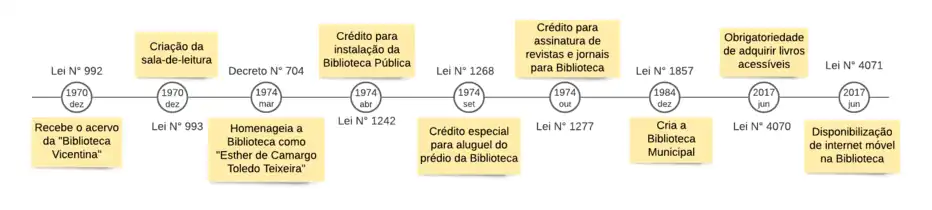 Já na segunda década do século XXI mais duas leis foram incorporadas à Biblioteca Municipal, estabelecendo primeiramente, quando houver aquisição de livros, a necessidade de se reservar uma parte da verba para compra de livros em formatos acessíveis, isto é, para pessoas com deficiência visual.[20] E também a obrigatoriedade de oferecer o serviço de internet móvel a todos, durante o horário de funcionamento da Biblioteca.[21]