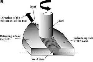 Este processo de deslocamento da ferramenta ao longo da linha de solda em um eixo tubular de metal plastificado resulta em severa deformação em estado sólido, envolvendo recristalização dinâmica do material de base.[3]