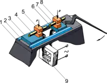 Os componentes a serem soldados são firmemente fixados nas garras de fixação do dispositivo de soldagem, que servem tanto como para a transmissão da corrente como para pressionar as peças entre si.[3]