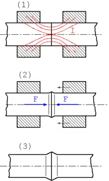 Ao pressionar os componentes juntos, um bom contacto é estabelecido em toda a área da secção transversal. A corrente que flui aquece todos os pontos de contacto até a temperatura de soldagem (fusão). Quando a temperatura necessária é atingida em toda a área da secção transversal da solda, o fluxo de corrente é interrompido e os componentes são firmemente comprimidos um contra outro por meio do movimento de avanço das garras.[3]