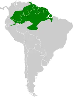 Pode ser encontrada nos seguintes países: Brasil, Colômbia, Equador, Guiana Francesa, Guiana, Peru, Suriname e Venezuela.