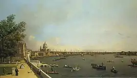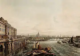 À época, o rio ainda não estava embancado. O Tâmisa bordejava a Ala Sul, onde três grandes arcos permitiam a entrada e ancoragem de barcos e barcaças dentro do edifício.