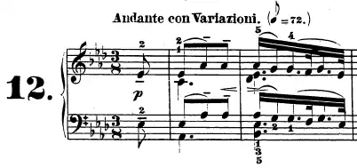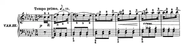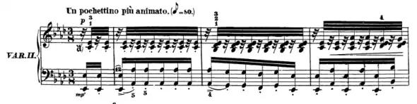 A última variação, por definição a mais longa e tecnicamente mais difícil (pois funciona como uma coda), apresenta uma relação ritmica intrincada. Quiálteras, semicolcheias e fusas tingem de preto as ultimas páginas deste movimento. As notas repetidas, que vêm lá do início do tema, voltam com toda força, criando o acompanhamento dessa variação final.