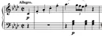 O primeiro movimento começa com uma sequência de notas arpejadas na tonalidade de fá menor. Muitos especialistas escreverem teses e artigos sobre a primeira nota. Se deve ser staccato, legato, etc. O tipo de articulação dessa primeira nota ainda gera controvérsias.