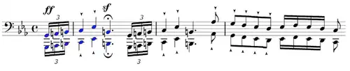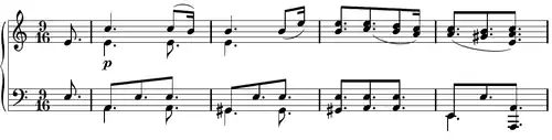 ) sobre um intervalo descendente de sétima diminuta (mi♭/fá #) tocado à oitava e seguido de dois acordes de sétima diminuta (fá #/mi♭/lá/dá) tocados sempre forte e sforzando (