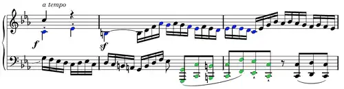 ) e em oitavas em registo grave, e repetida uma vez, a primeira parte do tema A é composta por uma anacruse em tercinas de semicolcheias, de duas semínimas (tónica dó, mediante mi♭) e sensível (si) valendo uma semínima prolongada. Incessantemente repetida e transposta, esta unidade rítmica e harmónica (I-III-VII, tónica-mediante-sensível) irá dominar uma grande parte do primeiro movimento[23]. Sempre à oitava e sem acompanhamento, o encadeamento é feito sobre uma sétima diminuta (si♮- lá♭, confrontando com o início do Maestoso) e a segunda parte é também repetida, atrasando ligeiramente (poco ritenente), depois ornado e a tempo.