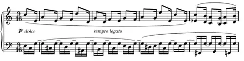 ) e encadeada num acorde de sexta (si♮, ré, sol) ressoando (Ped.) com um longo arpejo em crescendo (cresc.), prossegue com doçura e parece timidamente anunciar a tonalidade de dó menor.