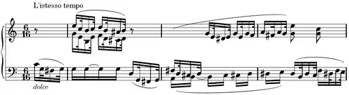 A segunda variação conserva o tempo (L'istesso tempo) e o espírito precedentes (dolce e sempre legato), mas o compasso passa a 6/16 (divisível em 2+2+2/16, como um 3/8 tomado em semicolcheias[N 1]). Os valores da célula inicial são mais breves: as «colcheia/semicolcheia» transformam-se em « semicolcheia/tercina de fusas »[N 2]. Esta metamorfose rítmica muito balanceada e as harmonias utilizadas (empréstimos frequentes e passageiros em outras tonalidades), prefiguram as músicas muito «swingadas» que surgiriam muitas décadas depois, em particular com o jazz.