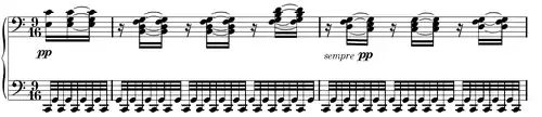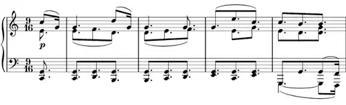 Esta fórmula, repetida duas vezes com harmonizações variadas, assenta sobre uma série de acordes moduladores, com rítmica de pontos duplos, tocada ‘’pianissimo’’ (
