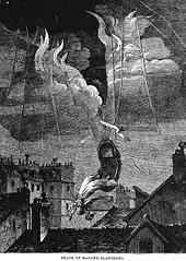 Houve uma pausa terrível, em seguida a Sra. Blanchard, enrolada nas redes do balão, caiu no telhado inclinado de uma casa na Rue de Provence, e depois para a rua, onde seu corpo estilhaçado foi recolhido.[26]