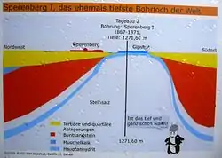 Corte esquemático do depósito de sal-gema de Gipsberg, onde foi determinado pela primeira vez o valor do gradiente geotérmico, num furo onde pela primeira vez se atingiram os 1000 m de profundidade.