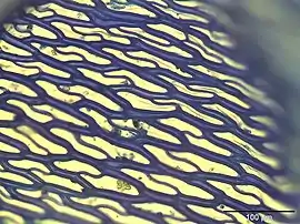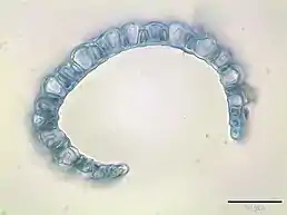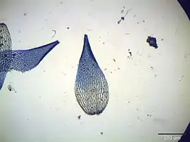 Filídio caulinar de Sphagnum subnitens (as células coloridas com corante azul).