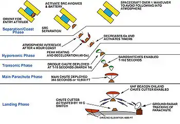 Inicialmente um pára-quedas piloto deverá se abrir quando a velocidade estiver mais reduzida pelo atrito da cápsula com a atmosfera. Quando a cápsula estiver a cerca de 3 000 metros de altitude, um segundo pára-quedas mais reforçado deverá se abrir. Então se iniciará uma transmissão de UHF que agirá como farol, para que a sonda possa ser rastreada por radares durante a sua descida.