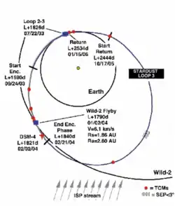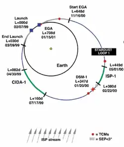 A sonda Stardust efetuará três órbitas em torno do Sol (loop) que levarão sete anos para completar, desde o seu lançamento até o seu retorno a Terra.