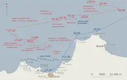 O contratorpedeiro britânico HMS Wrestler, que tinha sido encarregado de vigiar a entrada do porto, virou-se e lançou uma cortina de fumaça a fim de proteger a Força H do que parecia ser um ataque de contratorpedeiros. Isto acabou ajudando a obscurecer o Strasbourg, que, ao aumentar sua velocidade de quinze para 28 nós (28 para 52 quilômetros por hora), lançou no ar uma grande nuvem de fumaça preta. Os navios franceses navegaram por um buraco no campo minado defensivo para ficarem sob a proteção de uma bateria costeira de canhões de 240 milímetros no Cabo Canastel. Nesta altura, o Tigre e Lynx tinham se organizado à vante do couraçado enquanto o Le Terrible e Volta se posicionaram na retaguarda. Os dois contratorpedeiros da vanguarda lançaram cargas de profundidade contra o submarino HMS Proteus às 18h40min, forçando-o à manobras evasivas. Os contratorpedeiros franceses Bordelais e Trombe mais o barco torpedeiro La Poursuivante chegaram de Orã às 19h00min para ajudar na cobertura da retirada.[28]