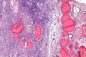 Também é possível que haja sinais de hipertireoidismo, já que o tumor pode produzir hormônios tireoideanos. Além disso pode se observar acúmulo de líquido na cavidade abdominal (ascite) e cavidade pleural (derrame pleural).