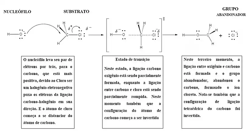 Este processo descrito acima, pode ser melhor ilustrado com um exemplo da reação entre o Clorometano e o Íon Hidróxido.