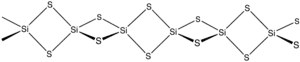 Forma-se o material pelo aquecimento de de silício e enxofre, ou pela reação de dupla troca entre SiO2 e Al2S3. Sua estrutura são cadeias de tetraedros ligados pelas arestas: Si(μ-S)2Si(μS)2 etc. A distância Si---Si é de 214 picometros, menor que as distâncias usuais das ligações simples Si-Si.[2]