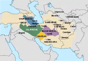 ![]() Alguns dos Estados sucessores do Ilcanato. O Sultanato Jalaírida aparece em verde | ||||||||||