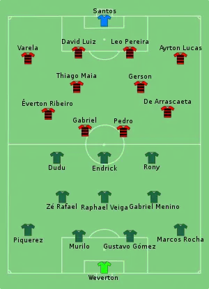 As duas equipes voltaram do intervalo sem alterações,[20] e o que se viu durante a segunda etapa foi um jogo frenético, movimentado, e com gols de ambas as equipes.[21][17][20] Perdendo por 2–1, o Flamengo pressionou nos primeiros minutos, obrigando o goleiro Weverton a fazer defesas em finalizações do atacante Pedro e de De Arrascaeta.[17][20][22][23](1:40–1:51) Até que, aos cinco, os cariocas deixaram novamente a partida empatada, e novamente com Gabriel Barbosa: ele recebeu passe em profundidade do meio-campista Éverton Ribeiro e tocou por cima de Weverton, na saída do goleiro.[17][20][22][23](1:51–2:10)
