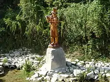 - Torre sineira (com capela funerária), estátua da Virgem Maria