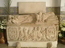 Está feito com mármore de Estremoz, e a figura esculpida no topo, com 1,89 m de comprimento, representa o escudeiro. Lateralmente estão representadas cenas de caça ao javali e cetraria.[5][9]