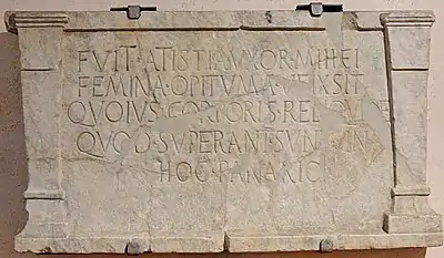 A porção sobrevivente da inscrição é "EST HOC MONIMENTVM MARCEI VERGILEI EVRYSACIS PISTORIS REDEMPTORIS APPARET" ("Este é o monumento de Marco Virgílio Eurísace, padeiro, contratante e servidor público").[1]