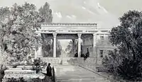 Nos jardins, um monumento muito mais substancial foi construído em 1773 durante o reinado de Carim Cã Zande. Localizado na margem norte do Rio Sazonal Rudkhaneye Khoshk nos Jardins Musalla, o Hāfezieh consistiu em quatro colunas centrais, com dois quartos construídos para o leste e o oeste e com os lados norte e sul abertos. O prédio dividiu os jardins em duas partes, com o laranjal na frente e o cemitério na parte de trás. O verdadeiro túmulo estava fora da estrutura, no meio do cemitério, com uma laje de mármore colocada no túmulo. O mármore foi gravado por um calígrafo com extratos da poesia de Hafez.[2]