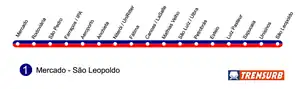 Atualmente, a Linha 1 do Trensurb possui 22 estações, sendo: seis em Porto Alegre, seis em Canoas, uma em Esteio, duas em Sapucaia do Sul, três em São Leopoldo e quatro em Novo Hamburgo.
