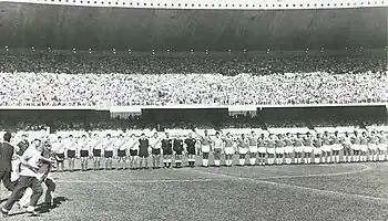 Imagem da Seleção Mineira e do River Plate, protagonistas do jogo inaugural do estádio Governador Magalhães Pinto.
