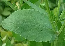 Porém, do que toca às folhas, são simples e perenes, caracterizam-se pelo formato oval, com limbo entre o crenado e o dentado, com ponta aguda.[11] As folhas basais podem medir entre 12 a 20 centímetros de comprimento e 1 a 1,5 centímetros de largura.[1] São folhas sésseis e ligeiramente pubescentes.[1]