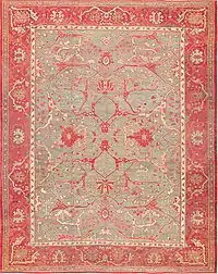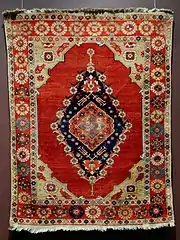 Os tapetes Usak de medalhão geralmente mostram um campo vermelho ou azul decorado com uma treliça floral ou foliar, medalhões primários ovoides que se alternam com estrelas de oito lobos menores ou medalhões lobados, entrelaçados com traçados florais. Sua borda frequentemente contém palmeiras em um pergaminho e folhas florais e caracteres pseudocoficos.[36] Esses tipos de tapetes, com seus desenhos curvilíneos, partem significativamente dos desenhos dos tapetes turcos anteriores. Seu surgimento no século XVI sugere um impacto potencial dos desenhos persas. Como os turcos otomanos ocuparam a antiga capital persa de Tabriz na primeira metade do século XVI, eles podem ter conhecimento e acesso aos tapetes dos medalhões persas. Vários exemplos foram encontrados na Turquia desde cedo, como o tapete que Erdmann encontrou no Palácio de Topkapi.[37] Os medalhões de tapetes Usak, no entanto, concebido como parte de uma repetição sem fim, representa uma ideia específica turca e diferente do entendimento persa de um medalhão central autônomo.[38]