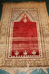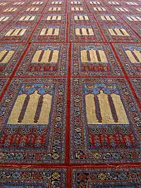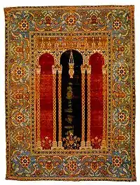 Um padrão islâmico específico é o padrão "mirabe" que define o "tapete de oração". O tipo mencionado acima é caracterizado por um nicho em uma extremidade, que representa o mirabe de cada mesquita, um ponto direcional para direcionar o devoto para Meca.[73] O padrão mirabe nos tapetes turcos às vezes é modificado e pode consistir em um único nicho, duplicado verticalmente ou horizontalmente. Portanto, o padrão de nicho pode variar de um entendimento arquitetônico concreto a um design mais ornamental. Os tapetes de oração costumam ser tecidos "para trás", como é evidente quando a direção do fio é sentida ao tocar o tapete. Isso tem ambas as técnicas — o tecelão pode focar primeiro no design de nicho mais complicado — como razões práticas — as pontas dos fios na direção da prostração do adorador.[74][75]