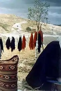 Nos lares tradicionais, mulheres e meninas usam a tecelagem de tapetes e kilims como passatempo e também como meio de ganhar dinheiro. As mulheres aprendem suas habilidades de tricô muito jovens, precisando de semanas ou meses para completar os tapetes e kilims de tecidos planos criados para uso na vida cotidiana. Como é fato na maioria das culturas de tecidos, mulheres e meninas são tradicionalmente as tecelãs.[57][58]