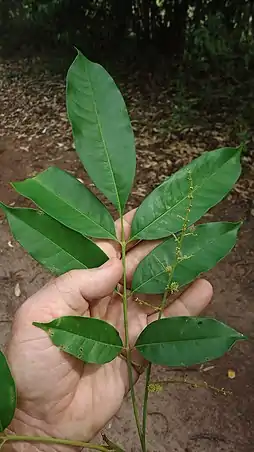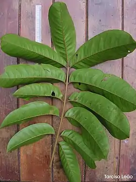 As folhas são compostas e com forma de penas, terminando com um folíolo. A base das folhas é arredondada ou com forma de cunha e seu ápice termina em ponta curta.[12] Perde uma parte das folhas durante as estações secas, mas recompõe de forma rápida.