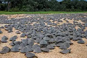 Os indivíduos da espécie são muito sociais, e migram em grupos durante a época de nidificação das matas inundadas para as praias de desova (tabuleiros). Ambos macho e fêmea permanecem na praia, no sol, até que os ovos eclodam, e depois voltam para o ambiente alagado. Esse comportamento de migração em grupo favorece os indivíduos contra predação.[18]