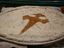 A origem da Cruz de Santiago representada na sua superfície data de 1924, ano em que a confeitaria «Casa Mora» de Santiago de Compostela começa a enfeitar as tartes de amêndoa com aquela que viria a ser a sua silhueta característica.